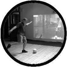 a sports partner miles away. I tried to find out what makes sports so much more fun than computer games, and figured it is the physical exertion that connects people: You get to know a person much faster during a sports game than in a formal setting like a business environment, because you might see how this person reacts when winning, and how when loosing. You will also learn when you can swear, because once your opponent swears, you can swear, too. Breakout for Two is a cross between soccer (football), tennis, and the popular video game Breakout. Participants in remote locations must throw or kick a real soccer ball at a local physical wall to break through a projection of virtual "blocks" that partially obscure a live video image of the other player. The effect is one of a virtual game "court" in which the competitors are separated by a glass wall through which they can interact. The trick is, that these blocks on each player's screen are synchronized - when one player breaks through a block, the same block disappears from the other player's screen. This is similar to tennis, where you always have to watch what the other player is doing, and differentiates this approach from a gym with a videoconference. The player breaking through the most blocks wins. The idea is that such a game might enhance the potential for social bonding, functioning as an "ice-breaker". This hypothesis was tested with 56 participants, who said they got to know each other better, became better friends, felt the other player was more talkative, and were happier with the transmitted audio and video quality in comparison to a control group playing an analogous game using a traditional keyboard interface. This work was presented at various international conferences and received international recognition, all papers, presentations, videos and posters available on http://exertioninterfaces.com.